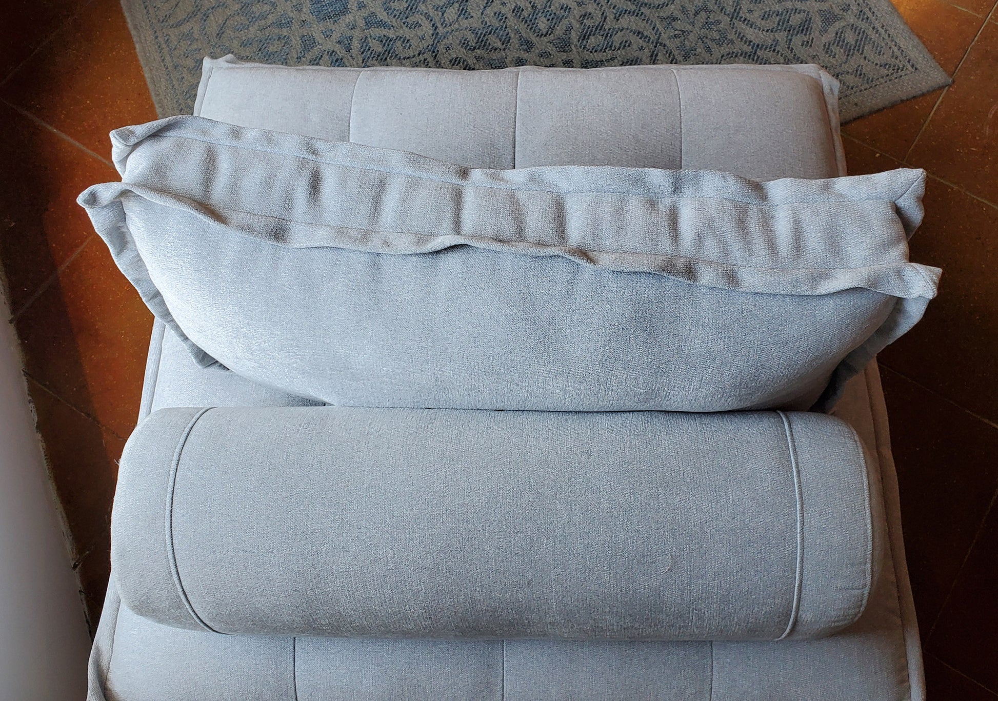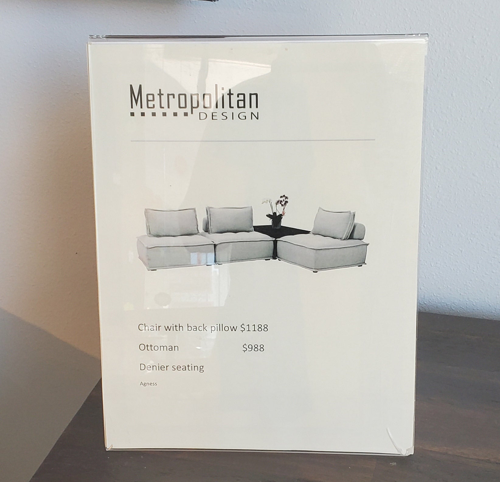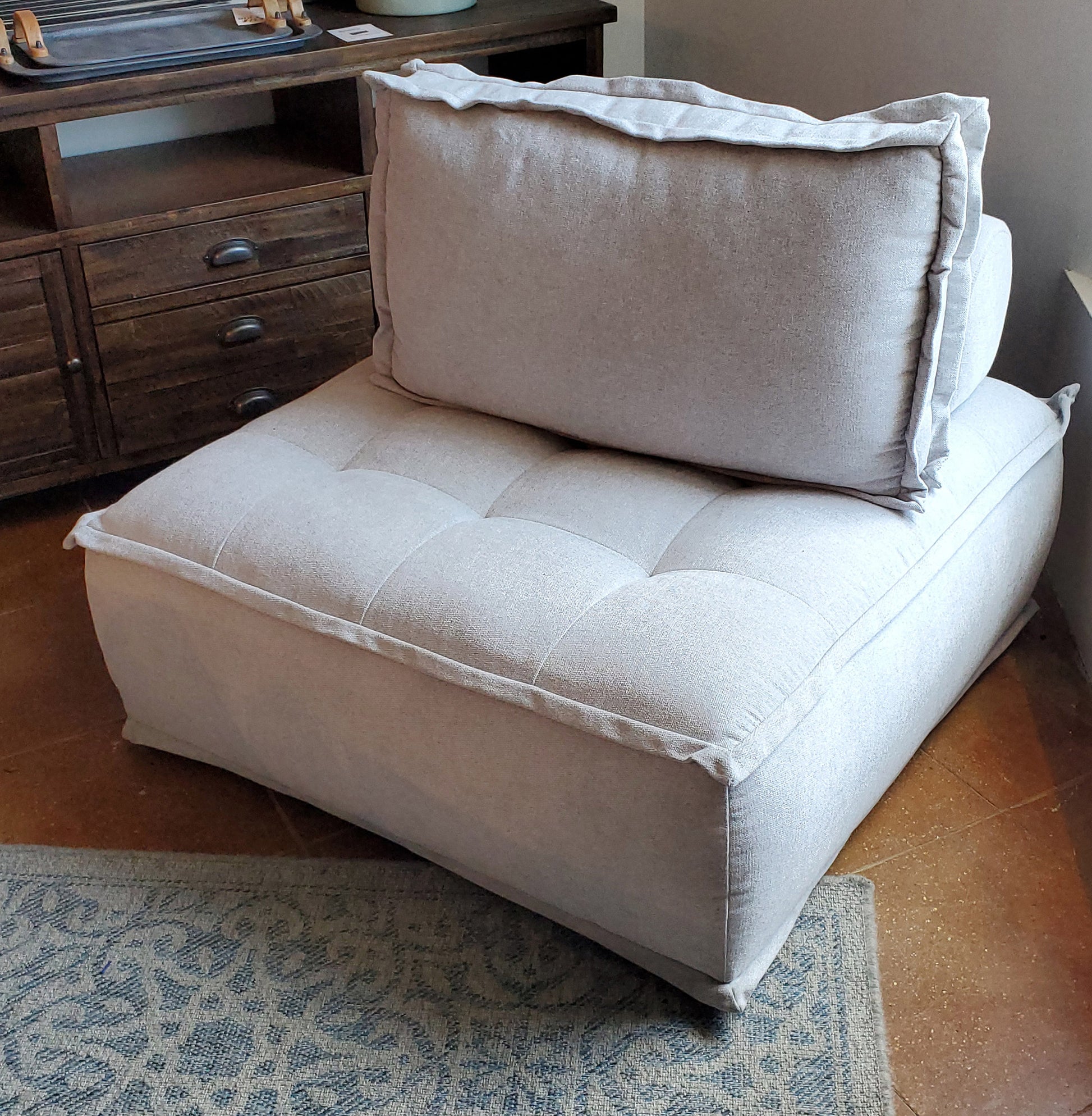 The Agnes Chair by Flores Design is part of the Agnes Collection. Easily build a modular sofa or sectional with this modular collection. The floor model has light fabric with piping on all edges. Can also be customized with any fabric you like.