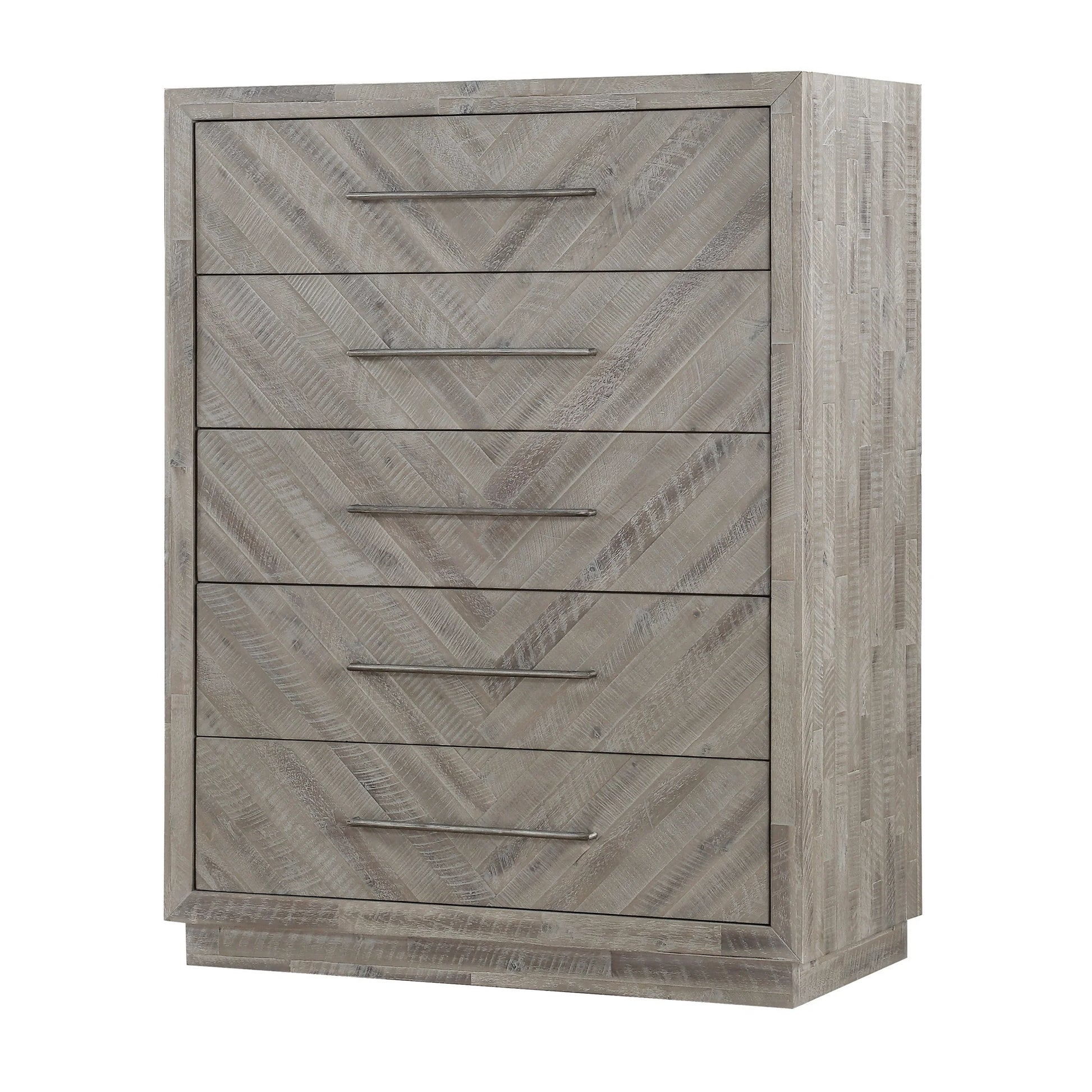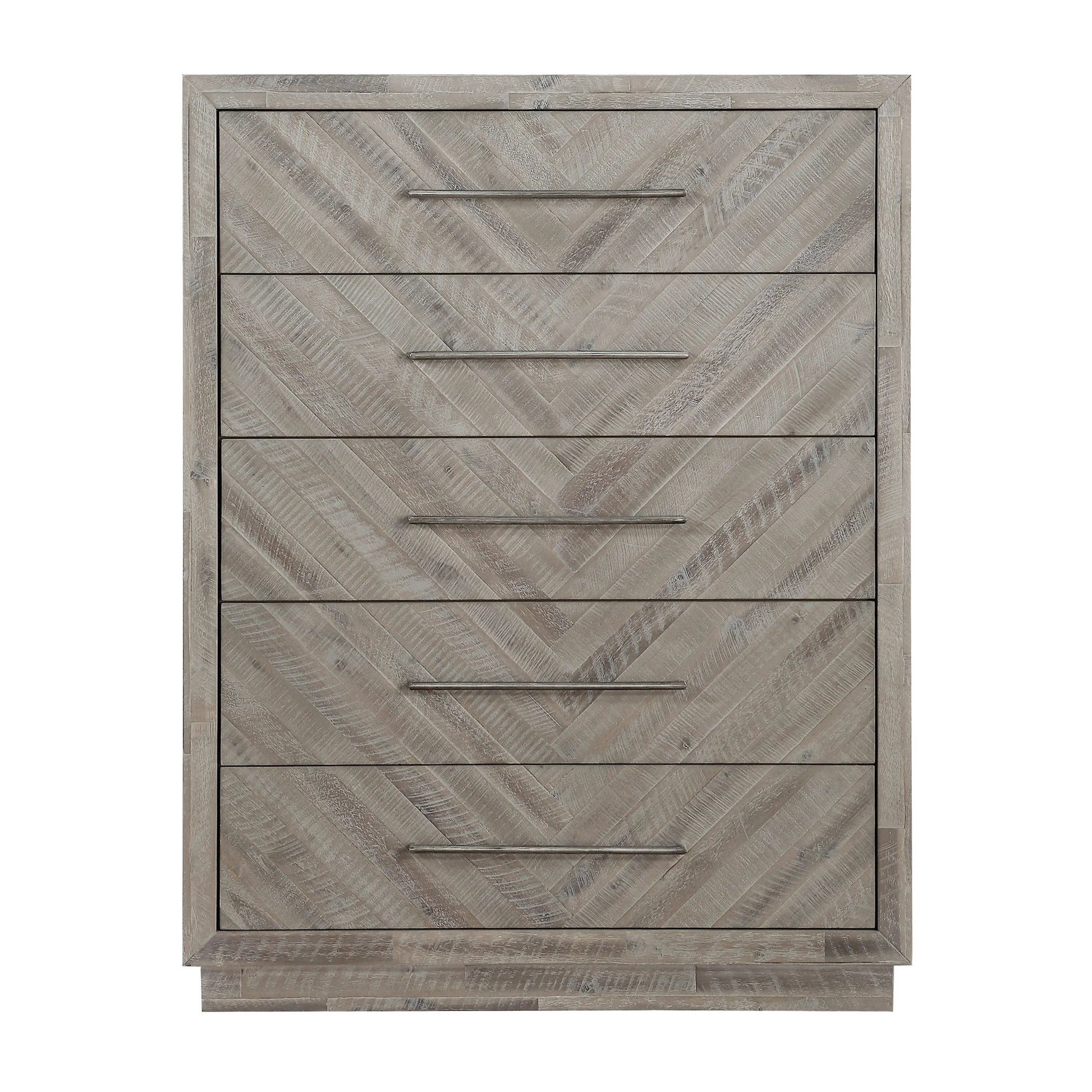 Rustic and contemporary. The Alexandra collection’s appeal comes from the roughhewn Acacia used in its creation. Hand-selected planks of solid wood are carefully sanded, stained and whitewashed for a driftwood appeal that accentuates the active grain and draws out natural knots and markings from the milling process. They are then inlaid over plywood to create a handsome herringbone pattern and finished with thin metal bar pulls for the crowning contemporary touch.