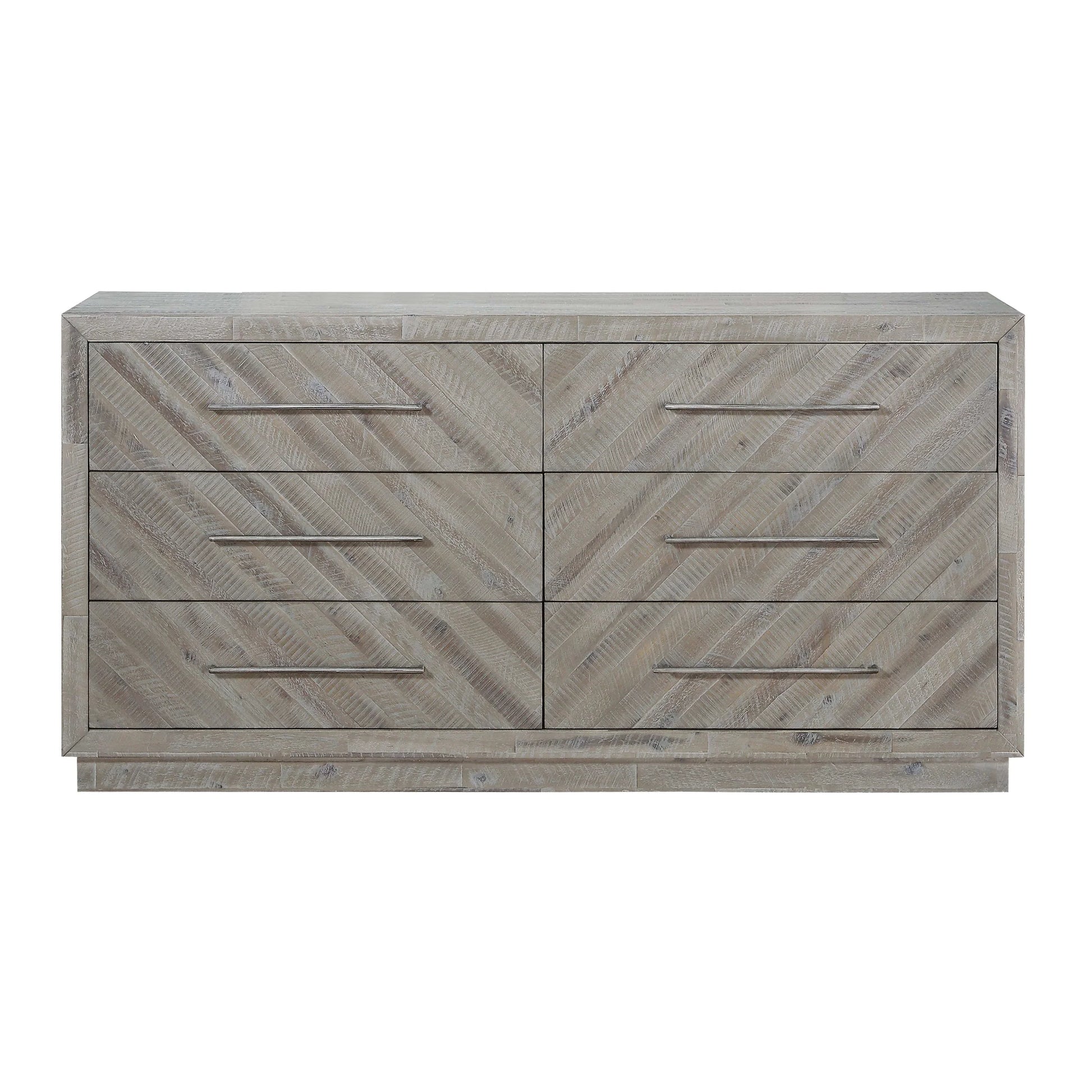 Rustic and contemporary. The Alexandra collection’s appeal comes from the roughhewn Acacia used in its creation. Hand-selected planks of solid wood are carefully sanded, stained and whitewashed for a driftwood appeal that accentuates the active grain and draws out natural knots and markings from the milling process. They are then inlaid over plywood to create a handsome herringbone pattern and finished with thin metal bar pulls for the crowning contemporary touch.