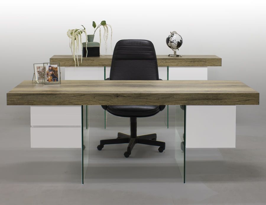 The Cora Desk is a unique, modern office centerpiece. Resting on two glass legs, this wooden executive desk seems floating and is perfect for an office or home. The Rustic Brown Oak top is framed on either side with white lacquer drawers (2 drawers and 1 file drawer). This piece will be the highlight of any contemporary office space.