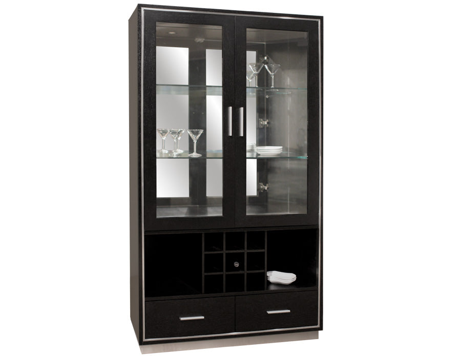 The Jordan Curio/Bar is an excellent piece for storage and display. The two drawers and glass shelves offer plenty of storage while the open shelves and bottle rack make it an ideal bar accessory. Two Halogen lights illuminate the display. This curio is great for any living or dining room. Width Depth Height Weight CFT