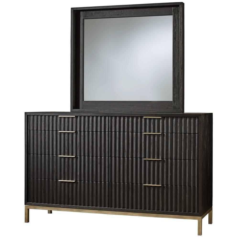 Inspired by the classic appeal of modern metropolitan design, the distinctive scalloped surface of our Kentfield collection is crafted from wire brushed solid Mahogany wood and stained in a Black Oak finish. Brushed brass top mount bar pulls and a tubular steel base provide the finishing touch.