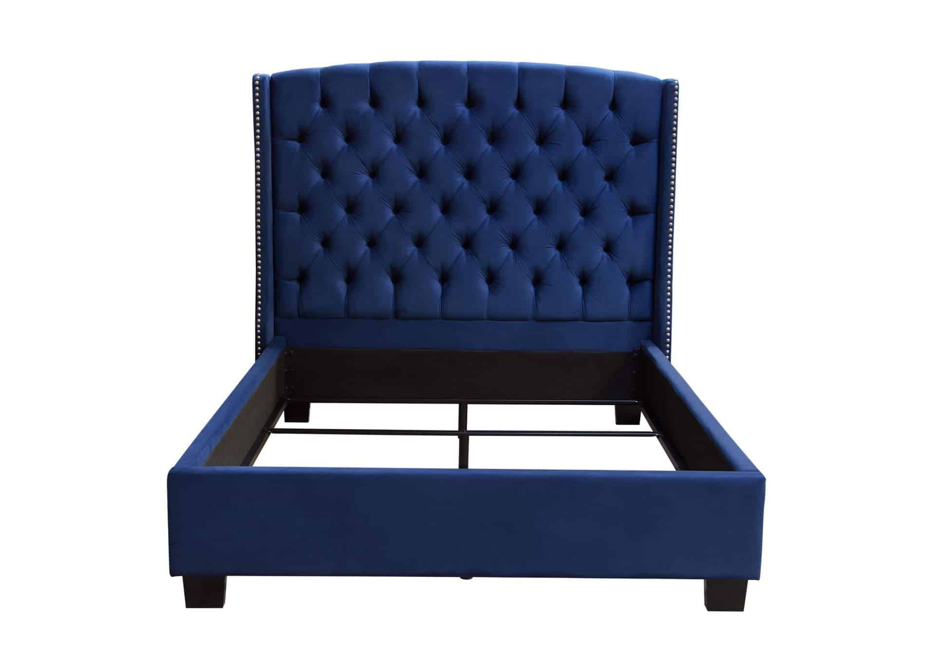 Majestic Queen Tufted Bed In Royal Navy Velvet With Nail Head Wing Accents