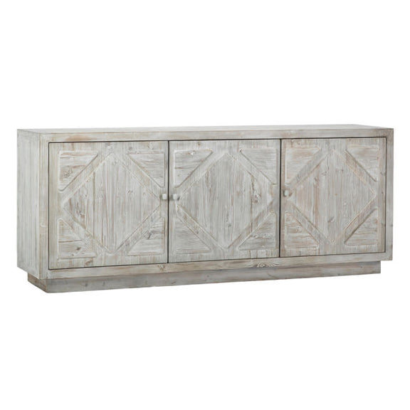 Dovetail Mallow Sideboard. Made of solid reclaimed pine wood, this large 84" sideboard is perfect for all your storage needs while adding a touch of freshness to your space. The Mallow Sideboard is finished in a white washed patina finished with a classic barnyard style 'x' carving on the three-door front with petite button knobs. The interior has 3 large shelves deep enough to hold large serving bowls.