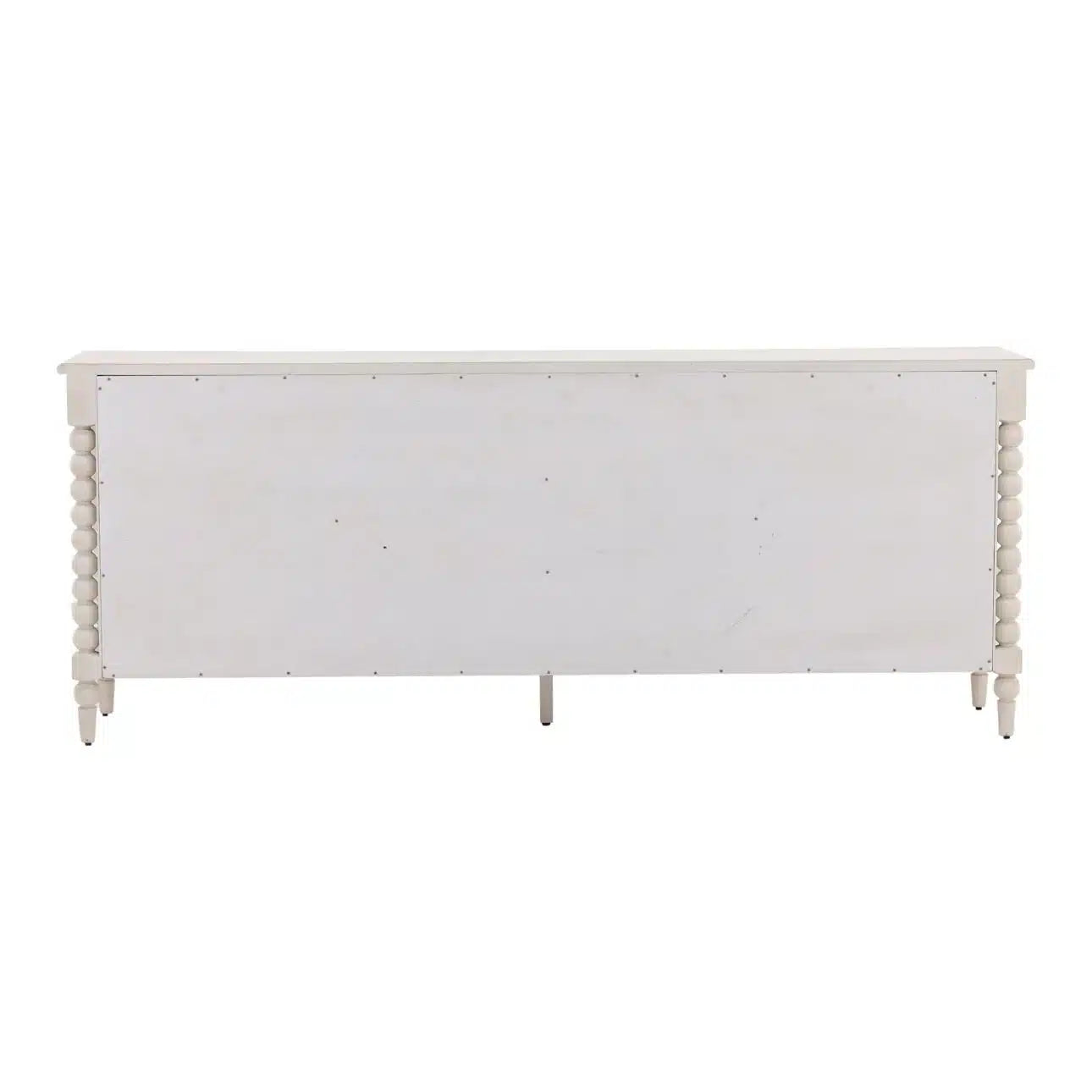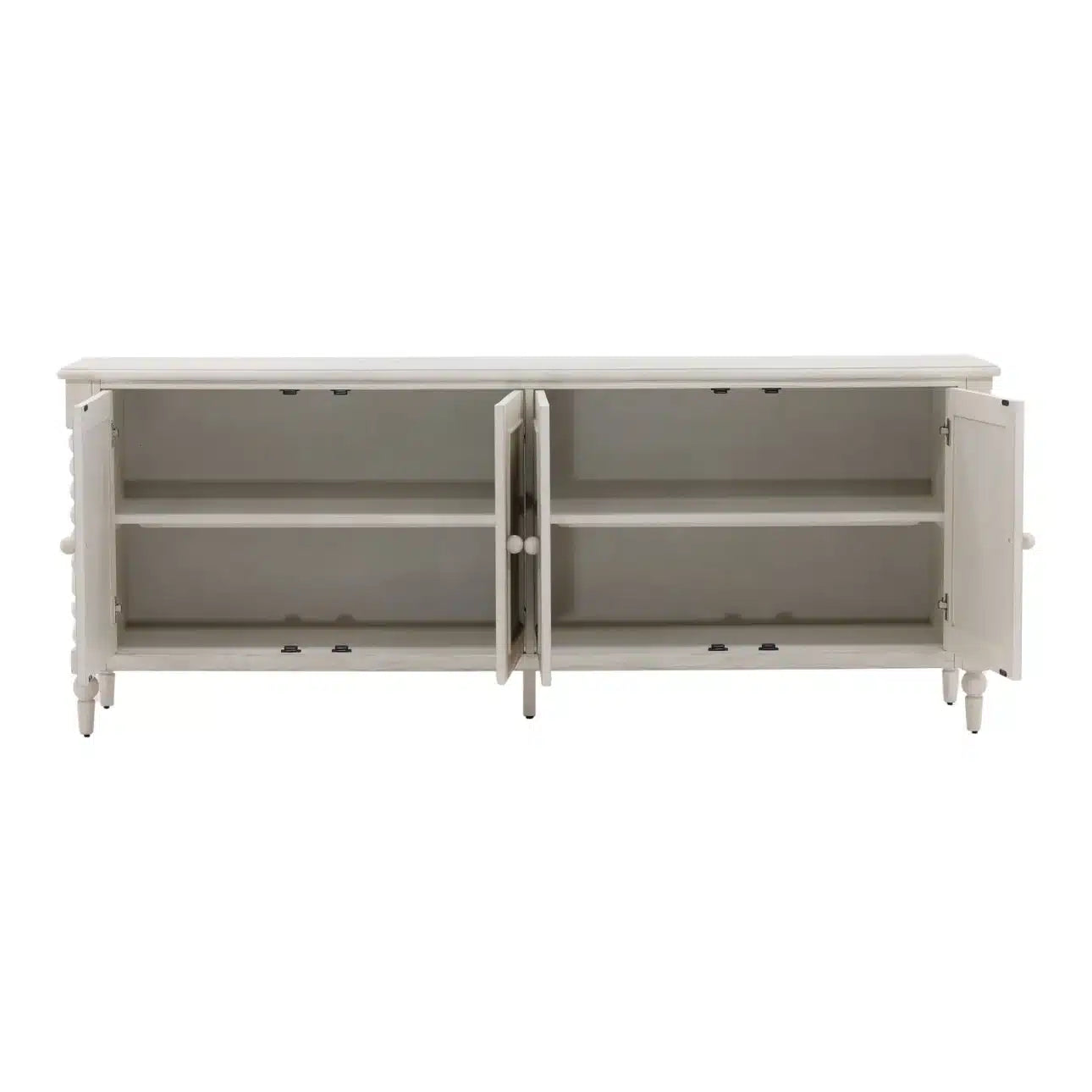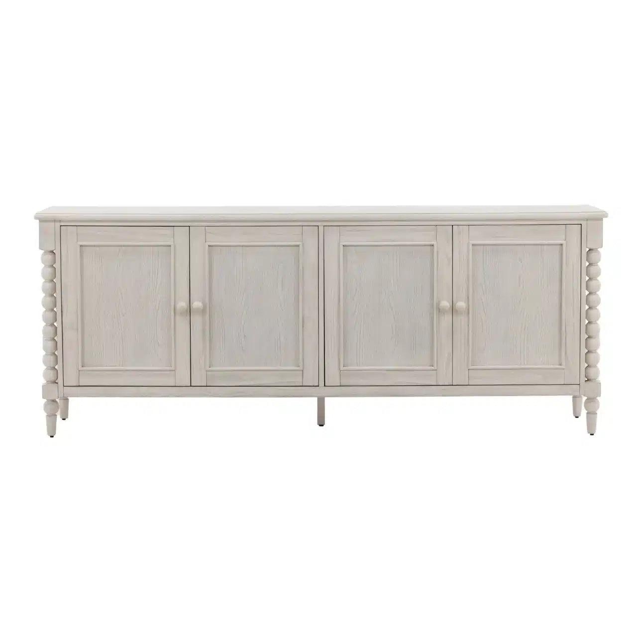 Bring timeless charm and practical storage to your home with this beautifully crafted farmhouse sideboard. Featuring a soft distressed white finish, this piece showcases classic panel detailing and unique turned spindle legs that add a touch of vintage elegance. Four spacious cabinet doors open to reveal ample storage for dinnerware, linens, or everyday essentials—making it a versatile addition to your dining room, entryway, or living space.