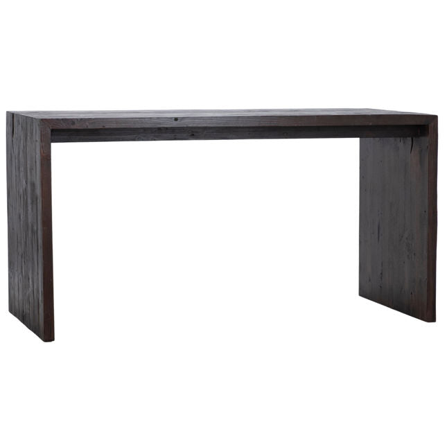 Dovetail Merwin Counter Table. Crafted from reclaimed pine wood, this 68" long counter table showcases the beauty of its natural texture in a minimalist design. Featuring two intentional wood cut-outs that add to its natural charm. Finished in a beautiful dark brown color to add a warm statement to your dining space.