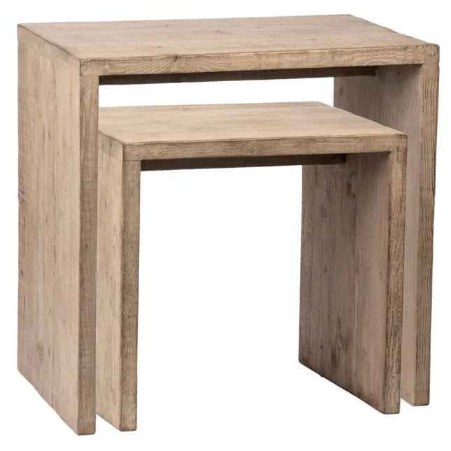 Crafted from reclaimed pine wood, this classic nesting side table set showcases the beauty of its natural texture in a minimalist design. Featuring two intentional wood cut-outs that add to its natural charm. Finished in a beautiful light warm wash color to add a neutral statement to your living room, home office, or sitting areas alike.