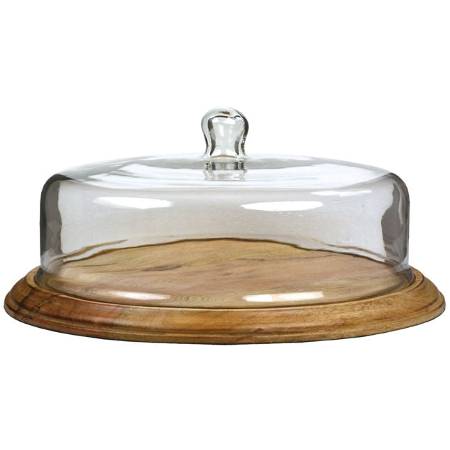 Dovetail Mikah Hurricane. Set a beautiful presentation of bread and sweets when welcoming guests into your home. This decorative pastry holder features a round wooden base made of pure mango wood in a medium brown finish. Topped with a beautiful clear glass dome with a thick and heavy frame to keep your desserts warm and fresh.