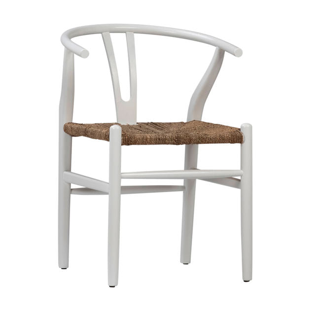Dovetail Moya Dining Chair A trendy take on a classic mid-century modern favorite. This dining chair stands out with its curved, antique white oak wood frame and wicker style seating. The woven seat adds an organic feel to the sculptural form and cutout back design. Certainly, a statement piece.