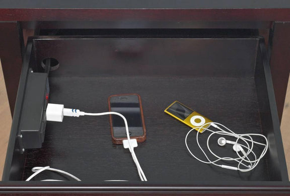 - In-drawer charging station provides convenient, clutter-free charging for mobile devices.
