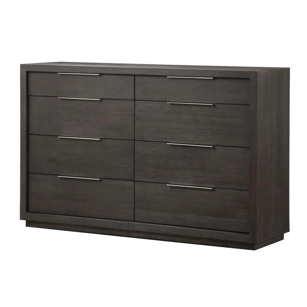The sleekly tailored Oxford collection makes a striking first impression with bold proportions, crisp, modern lines and a weathered finish. Smartly accented with top-mounted nickel plated pulls, concealed footboard storage, and a floating plinth base. Available in Basalt Grey. Solid Acacia with Acacia veneer Felt-lined top drawers Mitered top and side panels Wire brushing enhances natural grain patterns Sanded and stained solid wood drawer boxes with full-extension ball bearing glides and English dovetail joinery