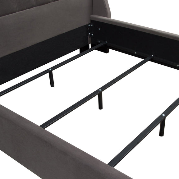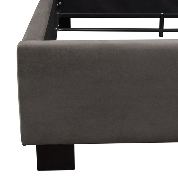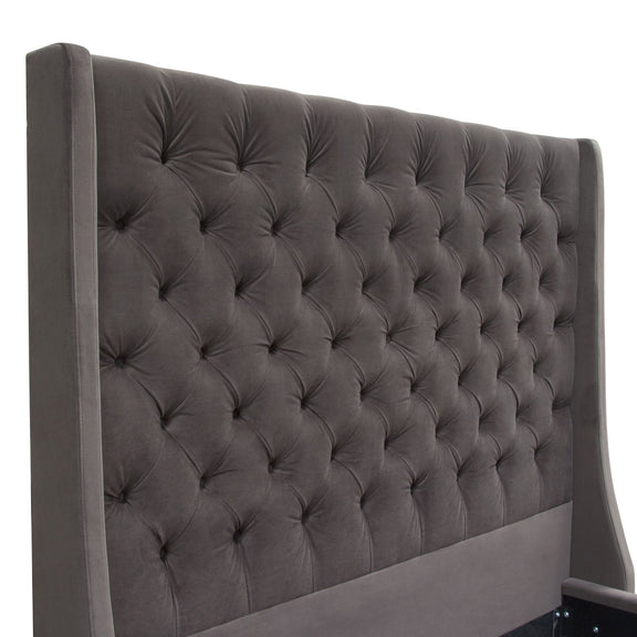 The Park Ave Bed by Diamond Sofa is a hand crafted / hand tufted upholstered bed standing 69 inches tall. The 12 inch frame includes four slats with center supports added into the cleats for structural integrity. With its tufted headboard, vintage wing accents and wood feet finished in a rich medium walnut finish providing the backdrop for the Smoke Gray Velvet finish - creating this timeless addition to any bedroom's decor. Bed is available in Queen & Eastern King sizes. Foundation or Box Spring is required.