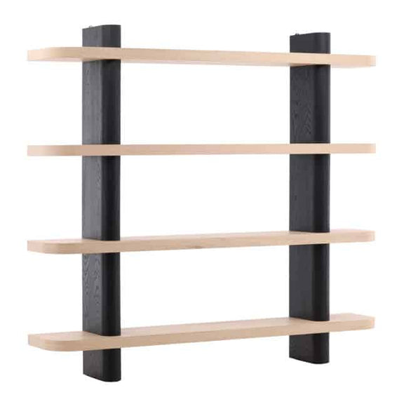 Doveatil Price Bookcase. Handcrafted and meticulously designed from sungkai wood and oak veneer. This bookcase has a striking two-tone finish, marrying a light natural wash with black wood, accentuating the allure of natural wood knots across its four-tier shelving.