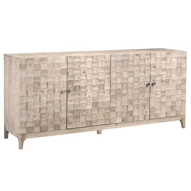 This uniquely designed sideboard will be a design favorite featuring a heavy reclaimed Pine hardwood construction with 3-D basket weave designed hand carved door front detailing finished in a light grey wash to bring out the grain and detailing of the hardwood. Each set of butterfly doors open to a large storage cabinet space with two shelves for ample storage solutions. This piece will make a beautiful addition to any room.