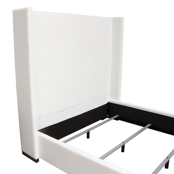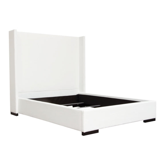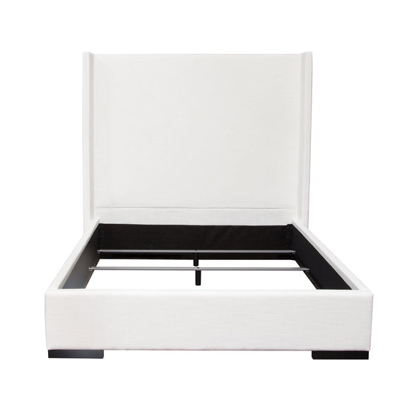 The Seattle Bed by Diamond Sofa is a hand crafted upholstered bed standing 69 inches tall. The 12 inch frame includes four slats with center supports added into the cleats for structural integrity. With its sleek, panel headboard, vintage wing accents and wood feet finished in a rich medium walnut finish providing the backdrop for the White Linen finish - creating this timeless addition to any bedroom's decor. Bed is available in Queen & Eastern King sizes. Foundation or Box Spring is required.