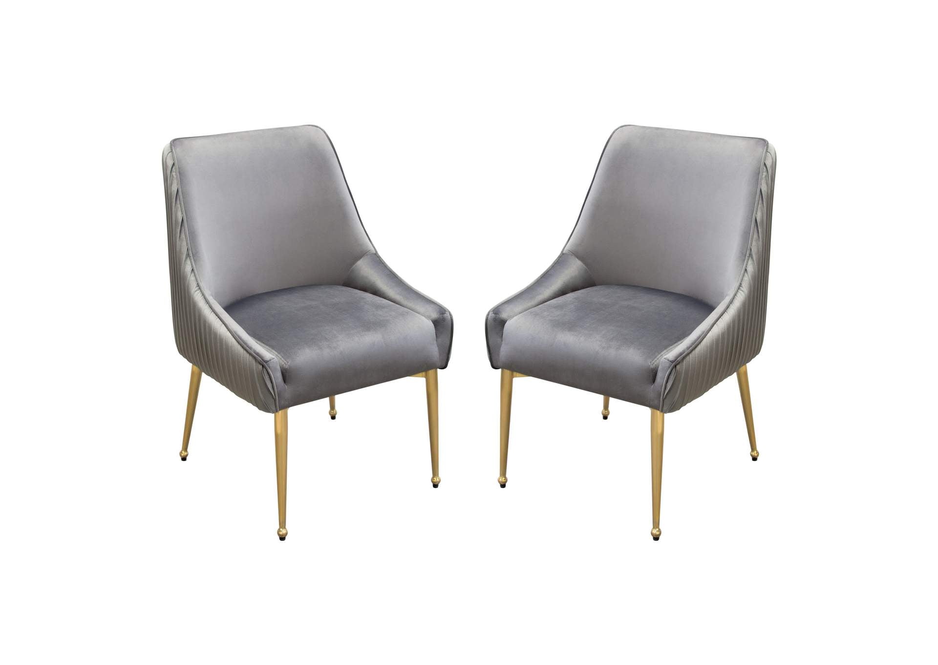 Set of (2) Quinn Dining Chairs w/ Vertical Outside Pleat Detail and Contoured Arm in Grey Velvet w/ Brushed Gold Metal Leg by Diamond Sofa