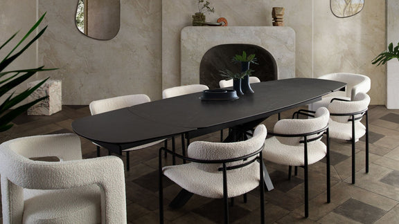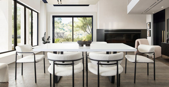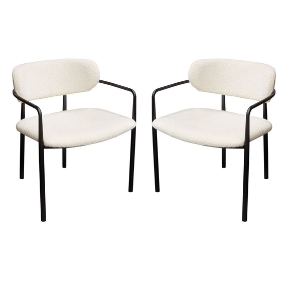 The Skyler Dining Chair by Diamond Sofa features a scooped seat covered in Ivory Boucle fabric contrasted by Black Metal Legs. Packaged & Sold as a 2-Pack.