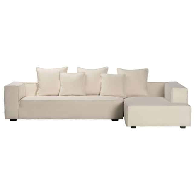 Showcasing a modern sofa-chaise silhouette and richly-textured upholstery. This luxurious sectional features wide track arms and right-hand-facing chaise wrapped in a warm cream-colored bouclé fabric and matching back and throw pillows, completed with black low-profile wood block legs. Style it with a throw blanket and accent pillows of your choice for a warm and collected look.
