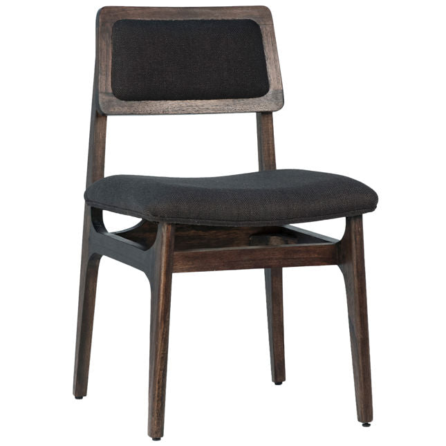 With its plush black linen upholstery and sleek modern styling our plush dining side chair will perfectly complement your dining table or accentuate your home office desk. Featuring a floating upholstered seat and back on a sturdy Mindi wood base finished in a rich espresso finish.