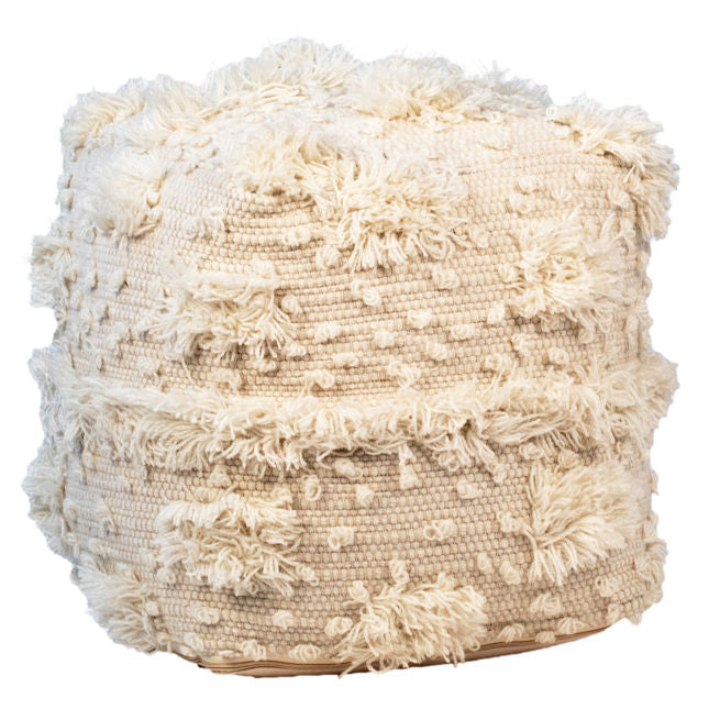 Dovetail Silves Pouf. Ready to bring an elevated touch to any space in your home. This 16x16” squared pouf is wrapped in beautiful ivory, handwoven wool with poly bead filling. It features hand-knitted polka dots and fringes all around for extra texture and comfort.