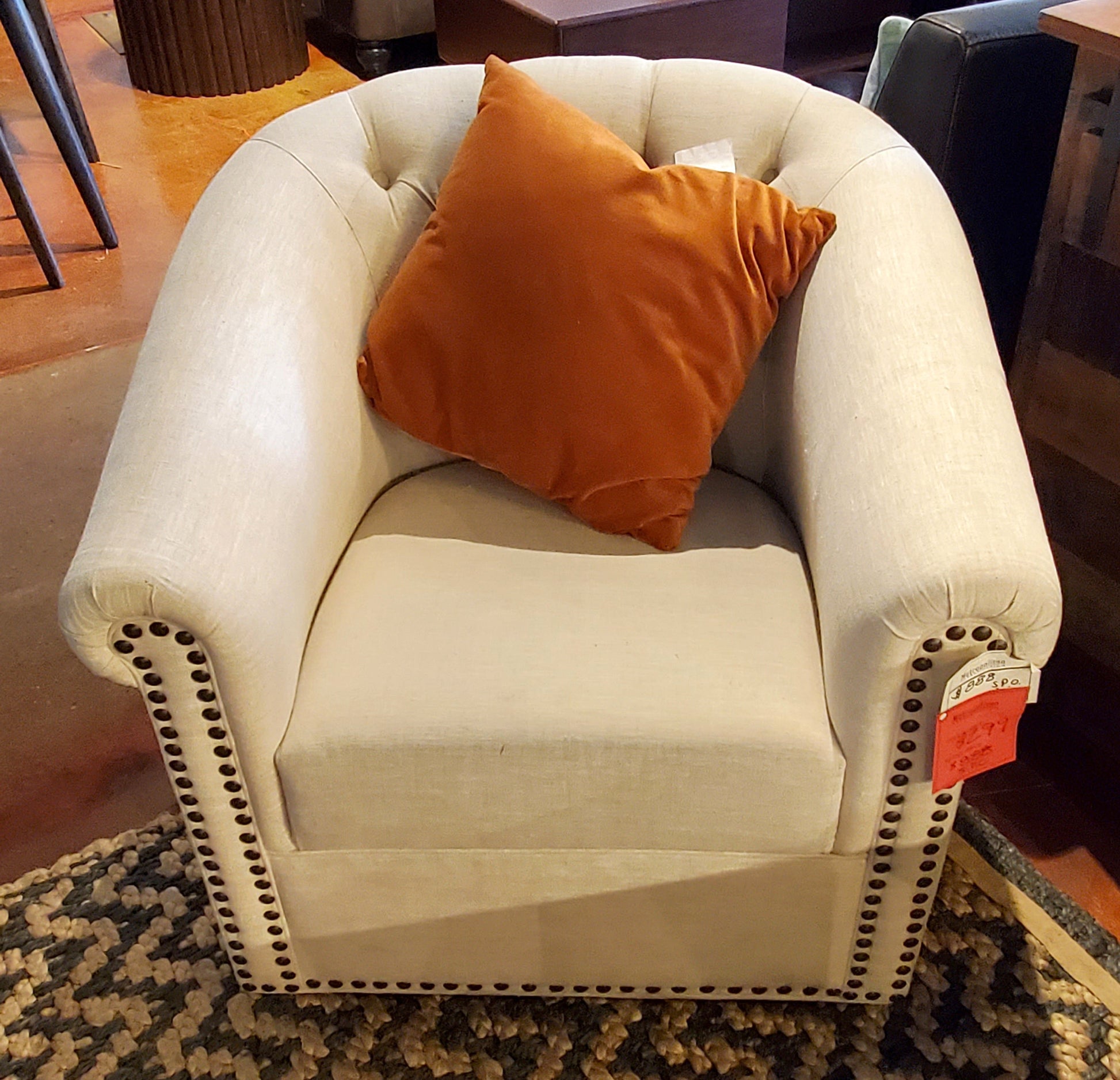 Sophie chair by Flores Design is a swivel chair with tufting on the backrest and nail-heads on the face of the chair. The floor model has natural fabric with large bronze nail heads Can also be customized with any fabric you like.