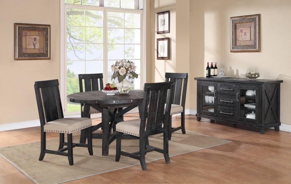 The Yosemite dining collection recreates the improvised, utilitarian look of early 20th century factory furniture. Rough-hewn planks crafted entirely from solid pine bear the characteristic saw marks, dents, pits, and random knots of logs milled on the steam-powered circular and sash saws of the era. A rustic black pine finish balances transparency and opacity to showcase these natural imperfections.