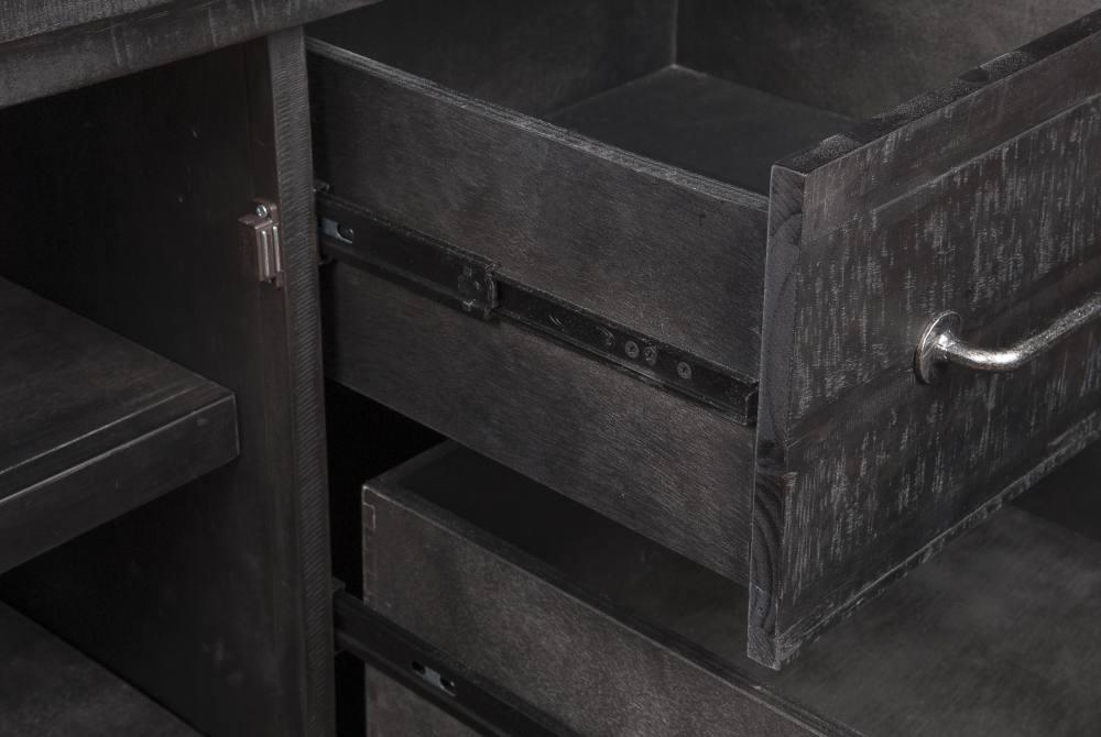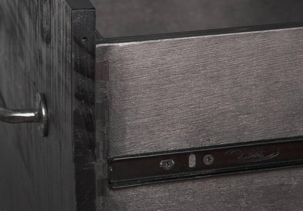 The Yosemite dining collection recreates the improvised, utilitarian look of early 20th century factory furniture. Rough-hewn planks crafted entirely from solid pine bear the characteristic saw marks, dents, pits, and random knots of logs milled on the steam-powered circular and sash saws of the era. A rustic black pine finish balances transparency and opacity to showcase these natural imperfections.